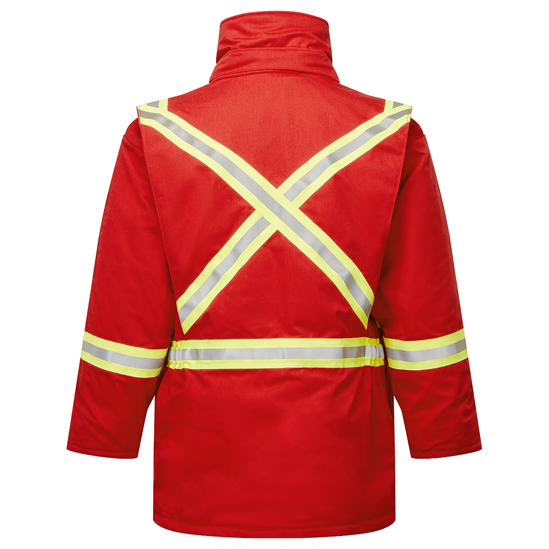 • SHELL FEATURES • Flame resistant and guaranteed for the life of the garment • Lowered X striping on back to allow more room for company logo or hooded undergarment* • Flame resistant fleece lined hand pockets • Multi-purpose protection from electric arc and flash fire • HiVisTex Flame ™ Ultra reflective striping • Two-way zipper INSULATION PACKAGE - 14 OZ QUILTED FEATURES • Wind and vapour barrier STANDARDS • Avenger fabric meets the requirements of: NFPA 2112, CGSB 155.20, NFPA 70E, CSA Z462, ASTM F1506